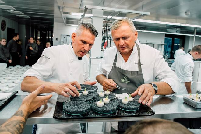 Zwei, die mit der Natur kochen: Norbert Niederkofler (links) und Sven Wassmer. Applaus für Renke und Saibling.