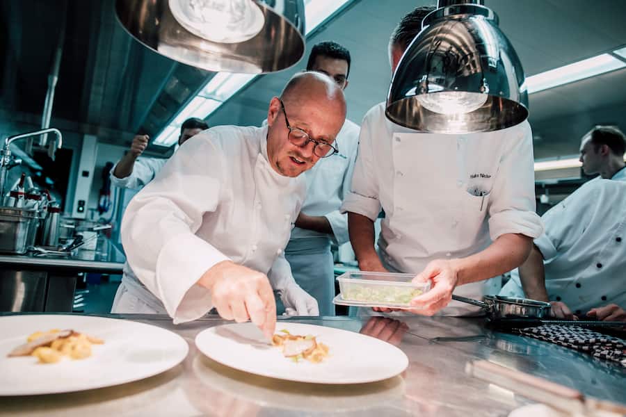 Klein klopft den Turbot. Ein Witzigmann kommt nicht mehr alleine. Der Elsässer Martin Klein ist der Mann an seiner Seite, seit 15 Jahren schon. «Ich bin mit Herrn Witzigmann mehr zusammen als mit meiner Frau. Und ich lerne jeden Tag etwas von ihm.» Klein führt das Kult-Restaurant «Ikarus» im «Hangar-7» in Salzburg (gehört Red-Bull-Besitzer Dietrich Mateschitz), hat schon 187 Gastköche aus der ganzen Welt in seiner Küche empfangen und selbst auch schon zwei Sterne erobert. Sein Hammergang im «Dolder»: Steinbutt im Salzteig, für 60 Personen. Klein klopfte im Eilzugstempo den Turbot aus der Kruste (nur das dicke Mittelstück!), servierte dazu eine sensationelle Steinpilz-Pinienkern-Vinaigrette. Da waren alle atemlos. Der neue BMW-CEO Paul de Courtois, Hauptsponsor des grandiosen Gourmetfestivals. Und auch die Profis draussen in der Küche.