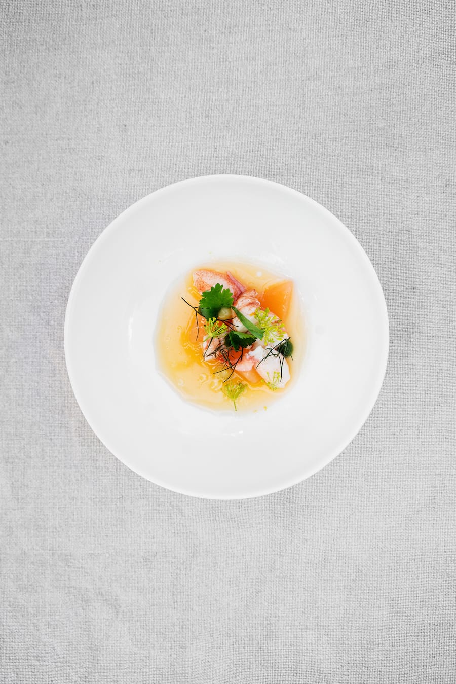 Flusskrebse mit Melone, Koriander, Dill und grünem Curry.