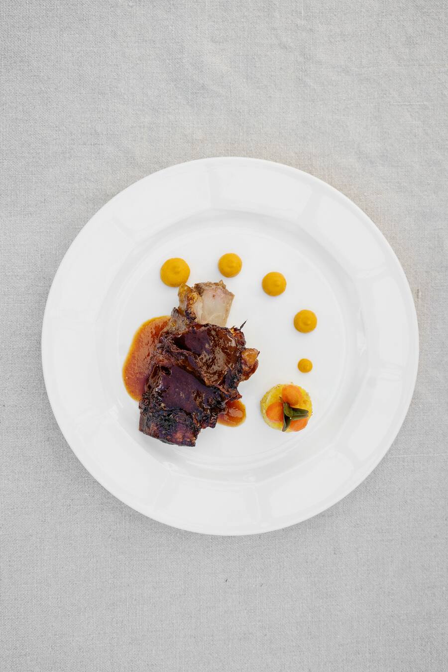 Im Restaurant stehen Langoustines aus Südafrika oder Kagoshima-Wagyu aus Japan auf der Karte. Auf ausdrücklichen Wunsch von GaultMillau-Chef Urs Heller kochte Ravet jedoch etwas rustikaler, aber nicht minder raffiniert: glasierte Kalbshaxe mit Polenta und einem Kardamom-Karotten-Püree.