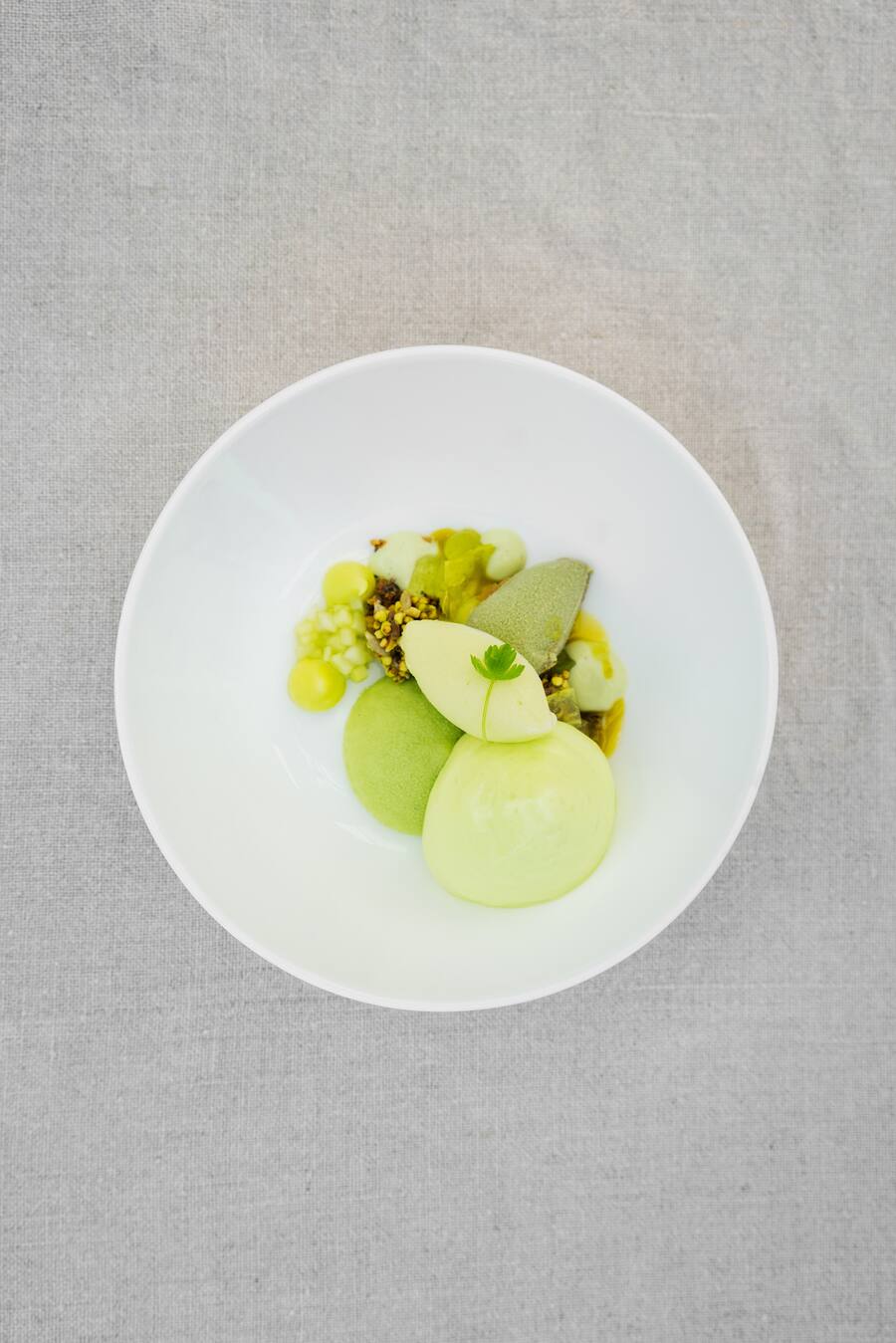 Der «Patissier des Jahres» aus Tanja Grandits Küchenbrigade kümmerte sich um das süsse Finale. Dank luftig leichten Texturen und zurückhaltender Süsse wirkte das Dessert wie eine frische Sommerbrise. Die Zauberformel? Gurke, Minze und Joghurt miteinander kombiniert als Mousse, Espuma, Sorbet und Drops an einer Limetten-Gurke-Vinaigrette.