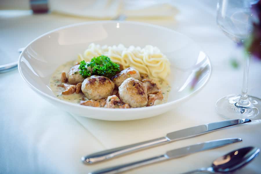 Typisch für die Küche von Benno Jud: Kalbfleisch-Hacktätschli mit Mascarpone und Eierschwämmli