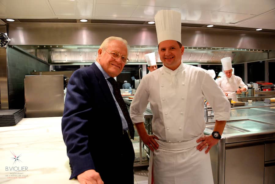 Herzklopfen! Der Titel «Koch des Jahres» verpflichtet: Franck Giovannini (Bild oben, zusammen mit «Köchin des Jahres» Virginie Basselot) verwöhnte nach der Ehrung 80 Gäste – und am Vorabend seine 19-Punkte-Kollegen Andreas Caminada, Peter Knogl, Bernard Ravet, Didier de Courten und Philippe Chevrier. Ehrengast bei diesem «secret diner» im Hôtel de Ville: Fredy Girardet, Gründer des «Wunders von Crissier». Auch die Koch-Ikone (man nannte ihn den «Papst») kann sich der Faszination dieses weltberühmten Restaurants nicht entziehen: «Ich habe jedes Mal Herzklopfen, wenn ich meine frühere Küche betrete. Giovannini: «Seine Anwesenheit ehrt mich.» Zum Dessert kriegte Girardet sein Lieblingsdessert: Einen hauchdünnen, noch warmen Apfelkuchen. Boskoop-Äpfel.
