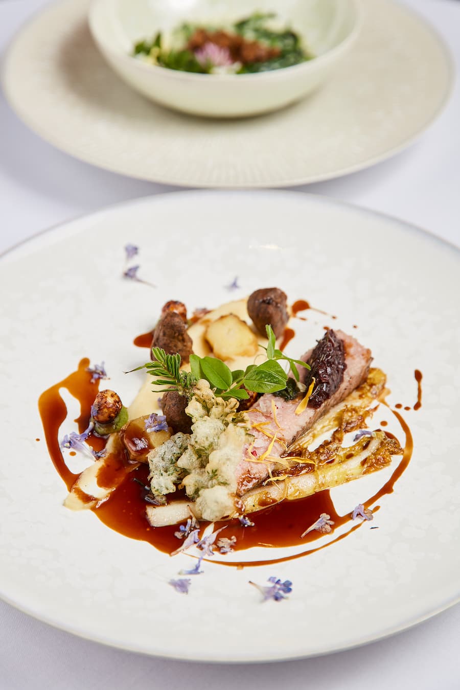Engadiner Kalb mit Taubnesselkrapfen, Buchenjus, Kerbel- und Löwenzahnwurzel und Honignüsse.