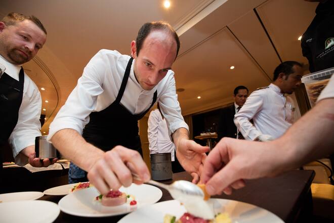 Balik & Yuzu-Dashi. Stefan Heilemann verblüffte erst mit einem sanften Balik-Lachs an einer fantastischen Dashi. Yuzu und Gurke stecken drin, die Vorspeise war japanisch, leicht, frühlingshaft. Auch der frechste Gang kam von ihm: Schweinshaxe mit Auster und Imperial Kaviar (Kilopreis: 10 000 CHF). Die Sau war leicht geräuchert, die Muschel jodig, der Rettich gepökelt – da hatten es die schwarzen Kügelchen nicht gerade leicht, sich durchzusetzen. Heilemann brachte seinen Star-Pâtissier André Siedl mit auf die «Excellence Queen»: Weisse Felchlin-Schokolade, der erste Rhabarber.
