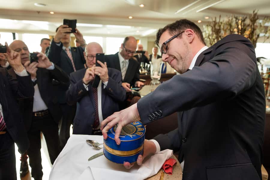 Kaviar aus der 1,8 Kilo-Dose. Eigentlich war’s eine Kaviar-Cruise. Und dafür öffnete Prunier die ganz grossen (Original-)Dosen. Zum Start gab’s für jeden Gast eine Nocke Oscietra – direkt auf den Handrücken. «Riechen, gucken, schlucken und einen Shot Wodka dazu», lautete die Empfehlung. Die Gäste waren begeistert, die Party lanciert.