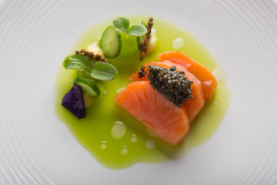 Grandioser Start: Balik Lachs, Dashi mit Yuzu, Gurke und «Paris»-Kaviar. By Stefan Heilemann.