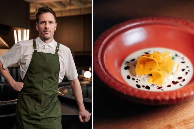 Traumhafte Schneekrabbe. Die letzte der drei Vorspeisen stellt die Schneekrabbe ins Rampenlicht. Ihr gezupftes Fleisch kombiniert Markus Arnold mit seiner Signature-Beurre-Blanc, geräucherten Gartenerbsen, gepickeltem Kürbis, Kürbiskernöl und Kakaonibs. Die leichte Bitterkeit der Nibs, die dezente Säure des Kürbis’ und das Rauchige der Erbsen lösen auf geschickte Weise die Üppigkeit der Sauce auf. Die Inspiration zu diesem kulinarischen Kunstwerk lieferte Arnold ein Besuch im neu mit drei Michelin-Sternen bewerteten Restaurant Evvai, der sonst aus geschmacklicher Sicht leider enttäuschend gewesen sei. «Den Snow-Crab-Gang hätte ich aber gerne zweimal gegessen», so der «Myle»-Chef. Im «Evvai» gab es zum Krustentier Eierstich, Weissweinschaum, Zitrusfrüchte, Chili und Kaviar aus Uruguay.