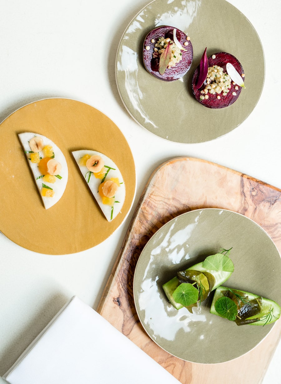 Diese Amuse-Bouche gibts auch für Karnivoren: Rande & Quinoa, eine Snackgurke und Kohlrabi mit Haselnuss.