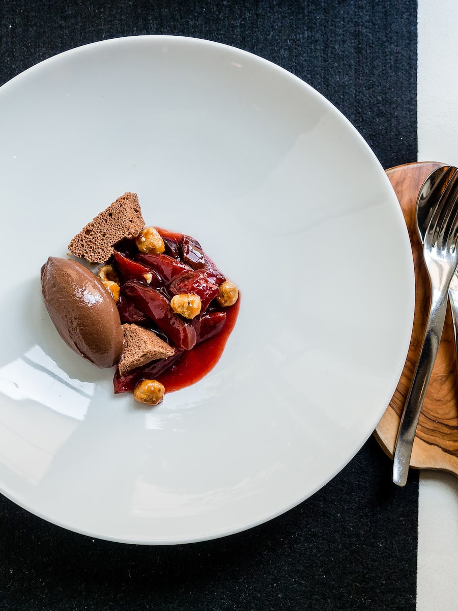 Dessert: Schokoladen-Sorbet und Luftschokolade auf Zwetschgen. Auch ohne Rahm perfekt!