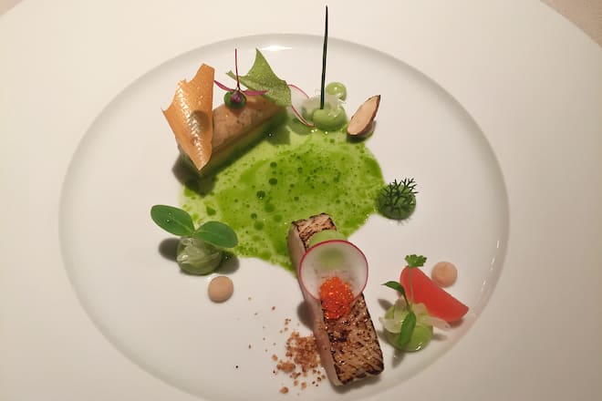Panzerknacker am Werk. Mahlers «erste Sinfonie»? Sechs sehr harmonische, eher sanfte Gänge, oft mit blitzsauberen Dashis als Basis und allzu oft mit als «Kaviar» deklarierte Fischeier als Komponente. Seine beste Nummer? Carabineros! Mahler knackte den feuerroten Prachtskrebs aus Südafrika aus der Schale, stellte aus der Karkasse ein wunderbares Carabinero-Öl und eine Krustentier-Essenz her. Ein vier Minuten im Dampf gegartes Eigelb kam dazu, floss nach der ersten Berührung in die Essenz. Eine schlicht geniale Verbindung, Mahlers coole Antwort auf die Onsen-Ei-Epidemie, die zurzeit grassiert in der Spitzenküche. Die Krustentieressenz war auch perfekt und der teure Krebs erst recht: Kaum gewürzt, viel Eigengeschmack, unglaublich knackig. Fische sind offenbar sein Ding: Auch die Königsmakrele (Hamachi), mal gedämpft, mal geflämmt, mit ein paar Zitrus-Tropfen, gefiel, ebenso die Brüggli-Lachsforelle: sanft gegart, mit einer Safran-Dashi und einem tollen Miso-Schaum.