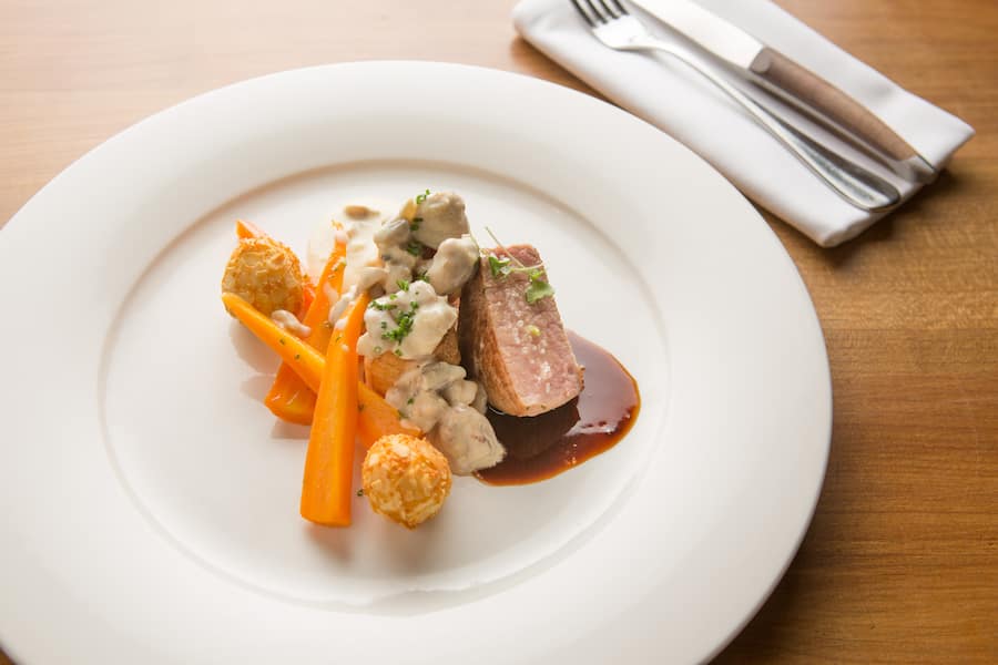 Zweierlei vom Simmentaler Kalb, Milkenpastetli, Mocken mit Portweinjus und Karotten sowie Kartoffel-Mandel-Kugeln.