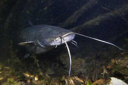 Freshwater fish European Catfish (Silurus glanis) in the beautiful clean river. Underwater shot of the catfish. Wild life animal. Catfish in the nature habitat with nice background. Live in the lake.
