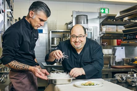 Antonio Colaianni, Leitung Gastronomie, Antonino Alampi (l.) Küchenchef, Zubereitung "Calamares-Mosaik mit Felsenhummerschwanz, Fenchel und Mönchsbart", Restaurant Gustav, Gustav-Gull-Platz 5, 8004 Zürich, am 20.04.2017 / Foto Lucian Hunziker
