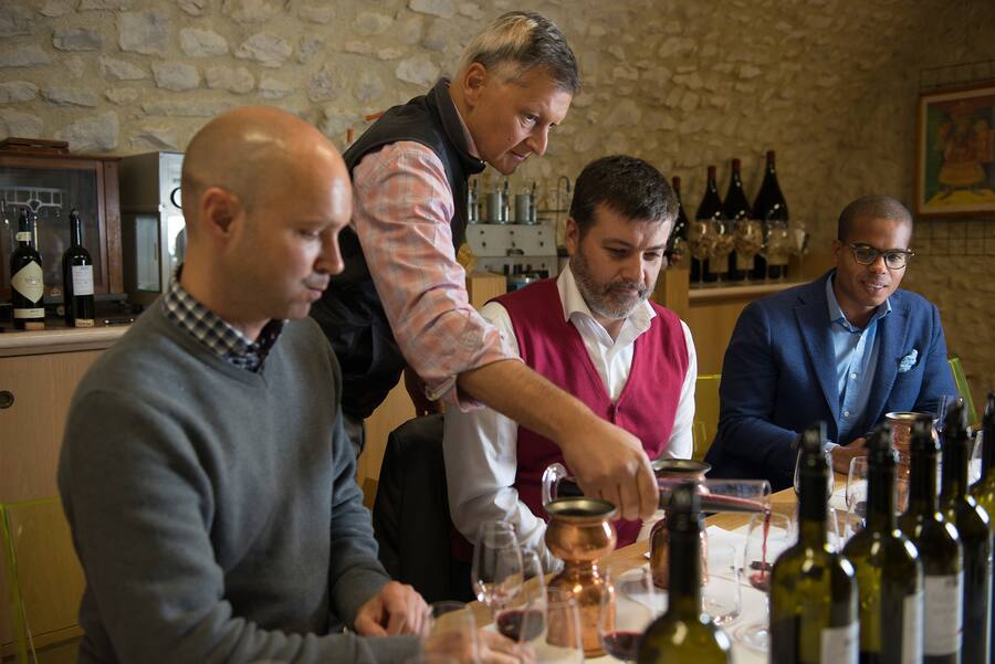 «Nummer 2 und 5»! «Ich bin überzeugt, dass wir dieselbe Linie auch mit diesem Jahrgang 2014 hinbringen», sagt Raffaele Boscaini, Marketingleiter und Vertreter der siebten Generation der Masi-Familie. «Glas 2 zeigt etwas mehr Eichennoten, Glas 5 dagegen mehr Frucht», analysiert Schwarzenbach. «Genau, die 5 ist sehr weich und elegant», bestätigt Andrea Dal Cin, der sich als Chefönologe für die Weinbereitung verantwortlich zeichnet und die Degustationsweine sorgfältig ausgewählt hat. Und lüftet dann sein Geheimnis: «In Glas Nummer 2 habe ich einen Mix aus der 1 und der 3 eingeschenkt.» Jan Schwarzenbach kostet noch einmal und sagt dann überzeugt: «Ich liebe diesen Blend. Ich schlage vor, dass wir einen Hauptanteil dieser Nummer 2 nehmen und dann 10 bis maximal 15 Prozent der 5 zufügen.» Der Master of Wine hat den Code geknackt. Schwarzenbach: «Mit diesem Wein bin ich glücklich, es wird ein wunderbarer Rosso Verona Cooperation 2014», sagt Schwarzenbach und strahlt, «genauso wunderbar wie der 13er.» Mehr als nur ein Geheimtipp für seine Kunden bei Coop und Mondovino.