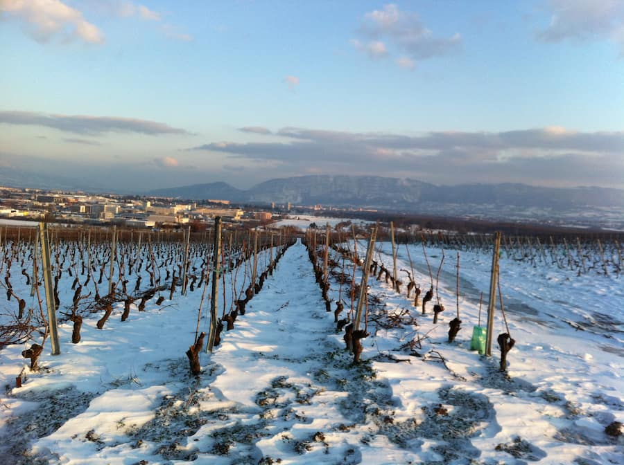 Von der Domaine du Paradis schweift der Blick über die schneebedeckten Rebberge hinunter zur Stadt Genf.