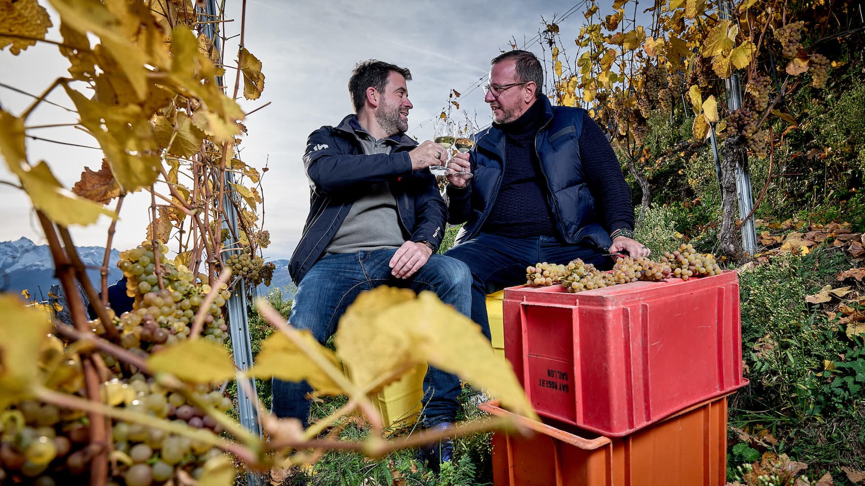 Ratsmänner im Rebstock: Philipp Matthias Bregy (l.) und Damian Cottier als Erntehelfer im Wallis.