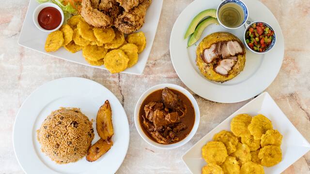 Mofongo, Tostones, frittierte Kochbananen, Frittiertes Poulet im Delicias Latinas an der Badenerstrasse