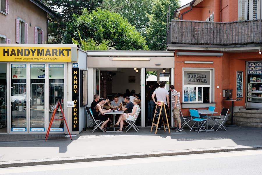 Ein Burger ist nur so gut wie sein Grundkonstrukt aus Fleisch und Brot. Bereits daran scheitern viele Zürcher Restaurants. Sie wollen stattdessen mit ausgefallenen Kreationen beeindrucken, die nur mit Messer und Gabel zu essen sind. Wer lieber seine Hände benutzt, muss beim Burgermeister an der Langstrasse vorbeischauen – nur wenige Schritte vom Limmatplatz entfernt. Dieser setzt auf klassische Burger-Kombinationen und solide Grundprodukte. Knapp 30 Sitzplätze bietet das winzige Lokal mit Möbel im Industrie-Look und Backstein-Tapete. Der Bestell-Prozess ist simpel: Gäste bezahlen an der Kasse und tauschen nach Aufruf ihrer Nummer ihr Papierzettelchen am Küchenfenster gegen die heisse Ware. Obwohl mittags die Warteschlange bis zum Eingang anwachsen kann, bleibt die Wartezeit meistens unter zehn Minuten.