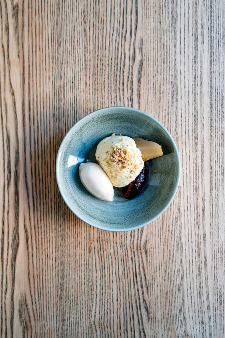Dann folgten warme Speisen. Ganz gut gefiel die grillierte Frühlingszwiebel mit in Nussbutter konfiertem Eigelb, Röstzwiebeln, Lauchasche und einer leicht säuerlichen Emulsion aus Frühlingszwiebeln. Ein Highlight war der mit Butter bestrichene, grillierte Spitzkohl mit Kombucha-Mayonnaise und Piment d’espelette. Frittierter Kohl sorgte zusätzlich für ein bisschen Süsse. Als Fleisch-Gang stand Lammkeule mit Rotkabis und Stängelkohl auf dem Plan. Obwohl das Lamm dank der Sous-vide-Garmethode tadellos und besonders saftig auf dem Teller landete, dürfen die Erwartungen an die Küche hier höher sein. Denn das Team rund um Küchenchef Ingo Papenberg zerlegt und verarbeitet ausschliesslich ganze Tiere. Richtig spannend wären daher Fleischgerichte, wo tatsächlich alles von Kopf bis Schwanz mitsamt Innereien auf den Tellern landet. Zum Abschluss trumpfte noch ein bestechend gutes Dessert mit einer ungewöhnlichen Kombination. Poschierte Birne, Püree aus gedörrten Birnen, Birnen-Glace, Rahm-Milch-Espuma und dehydrierter Stilton – einem englischen Blauschimmelkäse.