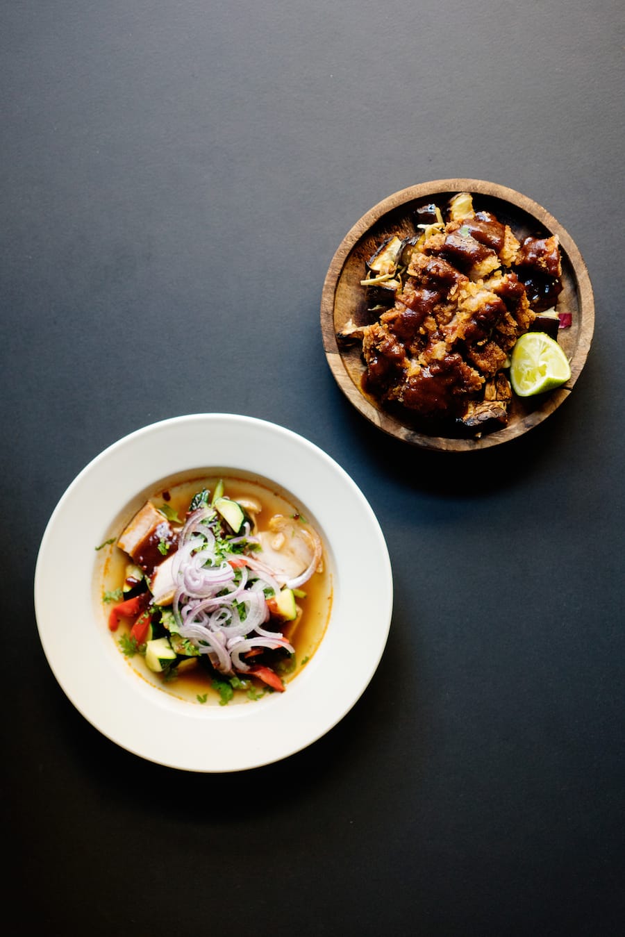 Wild und virtuos: Pochierter Schweinebauch oder Tonkatsu mit gerösteten Auberginen.