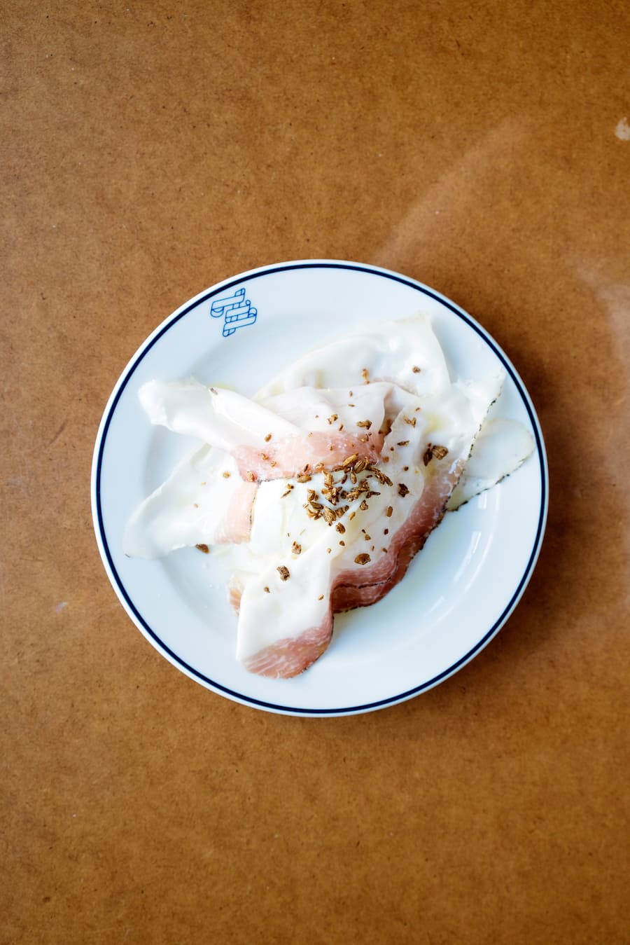 Burrata, Lardo und karamellisierte Fenchelsamen, die mit ihrem Aroma die geschmacklichen Schwergewichte auf dem Teller gekonnt unterstützen. Oder angetrocknete Randen mit Joghurt-Mayonnaise, gerösteten Haselnüssen und frischen Majoran-Blättern – eine klassische Kombination des Restaurants Gamper, die auch hier mit Süsse, Frische und erdigen Noten besticht. Neben den wechselnden Tellergerichten liegt der Fokus auf Eingemachtes und hervorragenden Konserven. Ein kantabrisches Sardellenfilet demonstriert mit seiner zarten, mürben Textur und komplexem Aroma wie die schmecken können abseits des Massenmarkts. Und auch der frisch aufgeschnittene Rohschinken harmoniert mit der dazu servierten Kaffee-Mayonnaise auf wundersame Weise. Alle Gerichte gibts ab 16.00 Uhr durchgehend bis nach Mitternacht, wenn die letzte Runde einläutet – eine Seltenheit in Zürich.