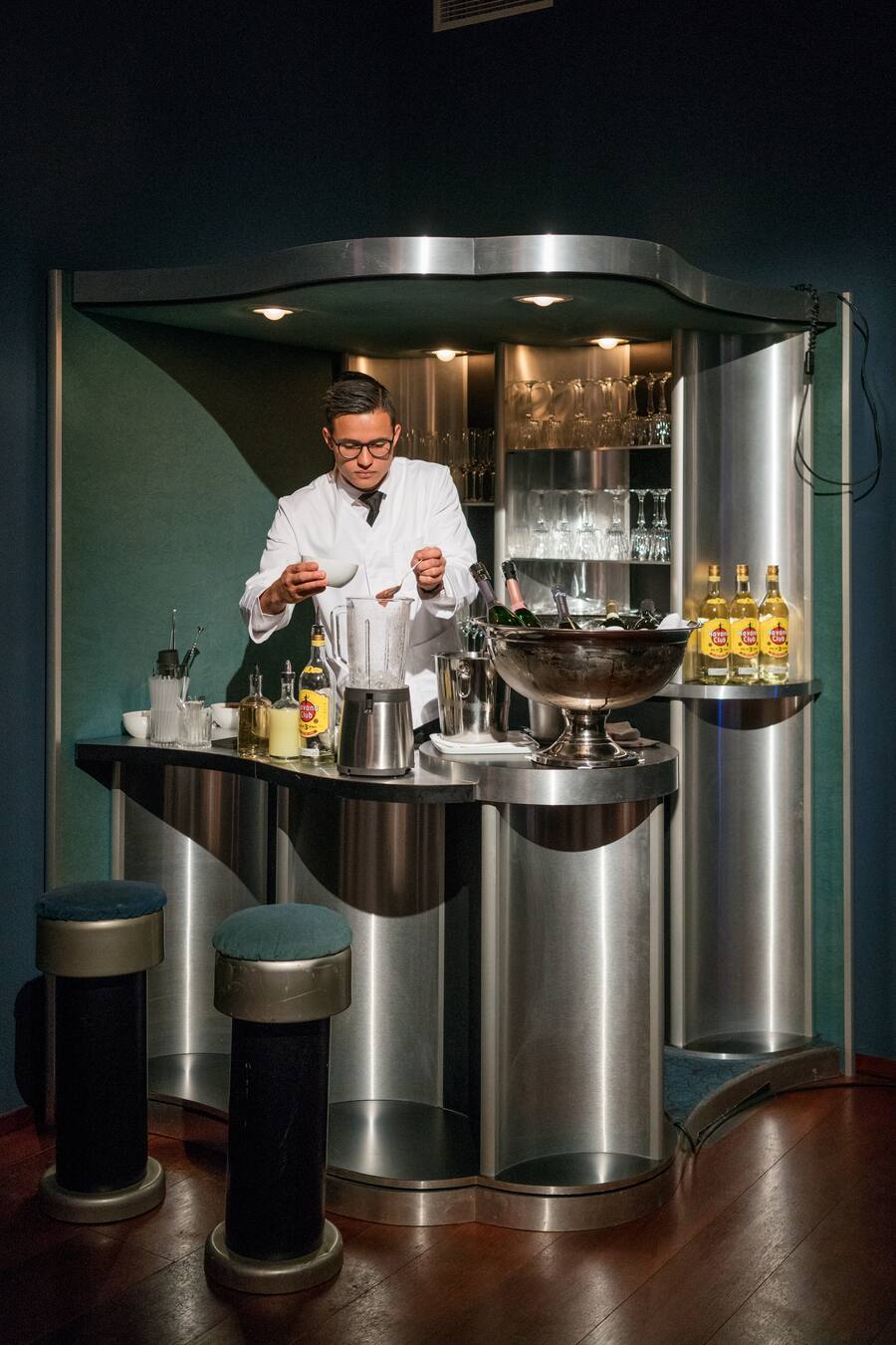 «De bescht Caterer, wo’s git», meint ein Gast als ich meine Runden drehe zwischen den opulenten Hausbars, die aus verschiedenen Jahrzehnten des 20. Jahrhunderts stammen. Die Rede ist vom Edel-Caterer Franzoli: Verantwortlich für Events mit Essen auf GaultMillau-Niveau und ein beliebter Zwischenstopp für viele trendige Zürcher Jungköche auf dem Weg zur Selbständigkeit. Franzoli hat sich mit dem Pop-Up «Hot Pot and Cocktails» im Zürcher Kreis 1 eingenistet in der Galerie Nadja Brykina neben dem Hallenbad City. Drinks gibts im Erdgeschoss, asiatischer Feuertopf – wir nennen es Fondue Chinoise – im Untergeschoss.