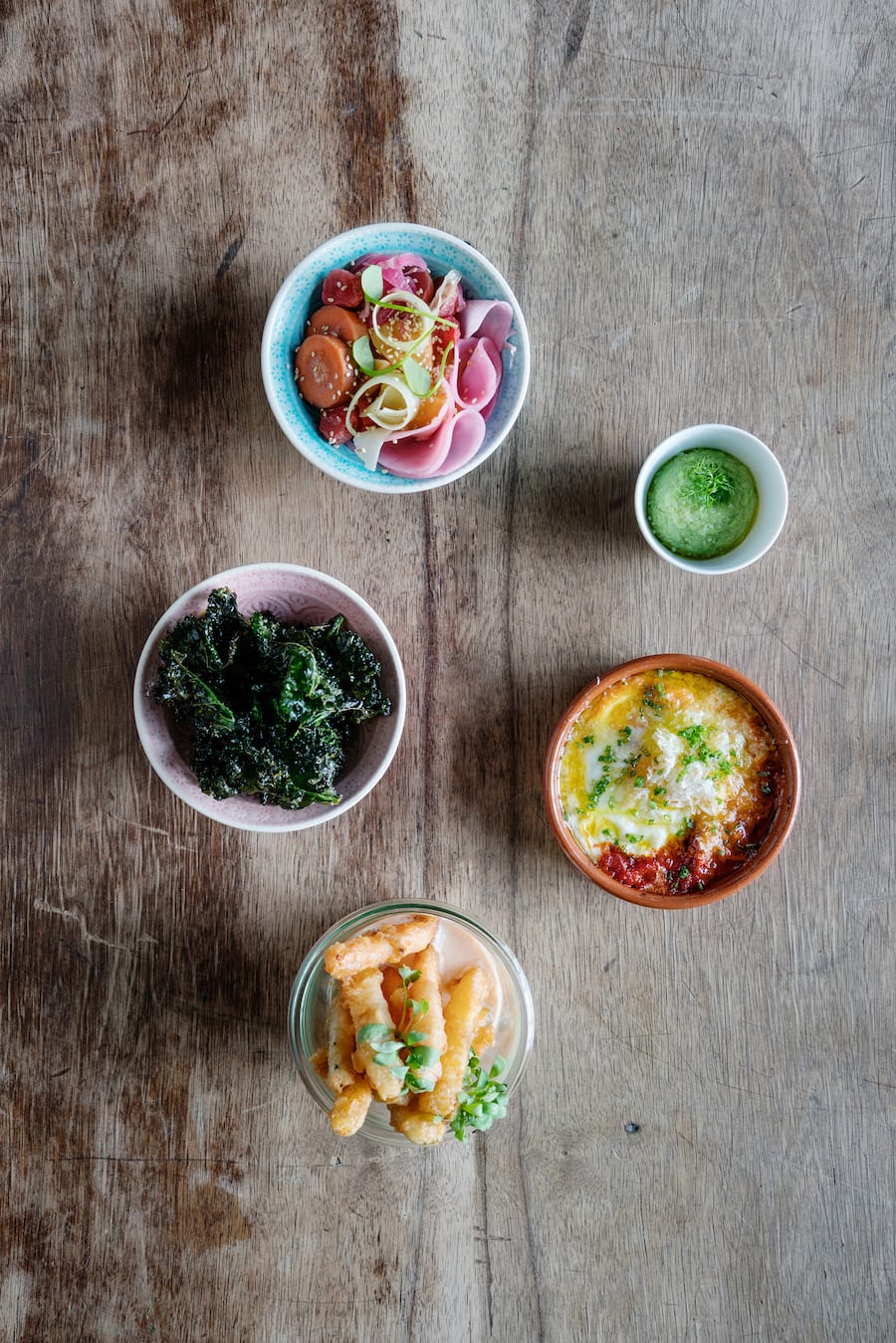 Eingelegtes Gemüse, Shakshuka mit Ei, Gemüse-Tempura-Sticks und frittierter Federkohl.