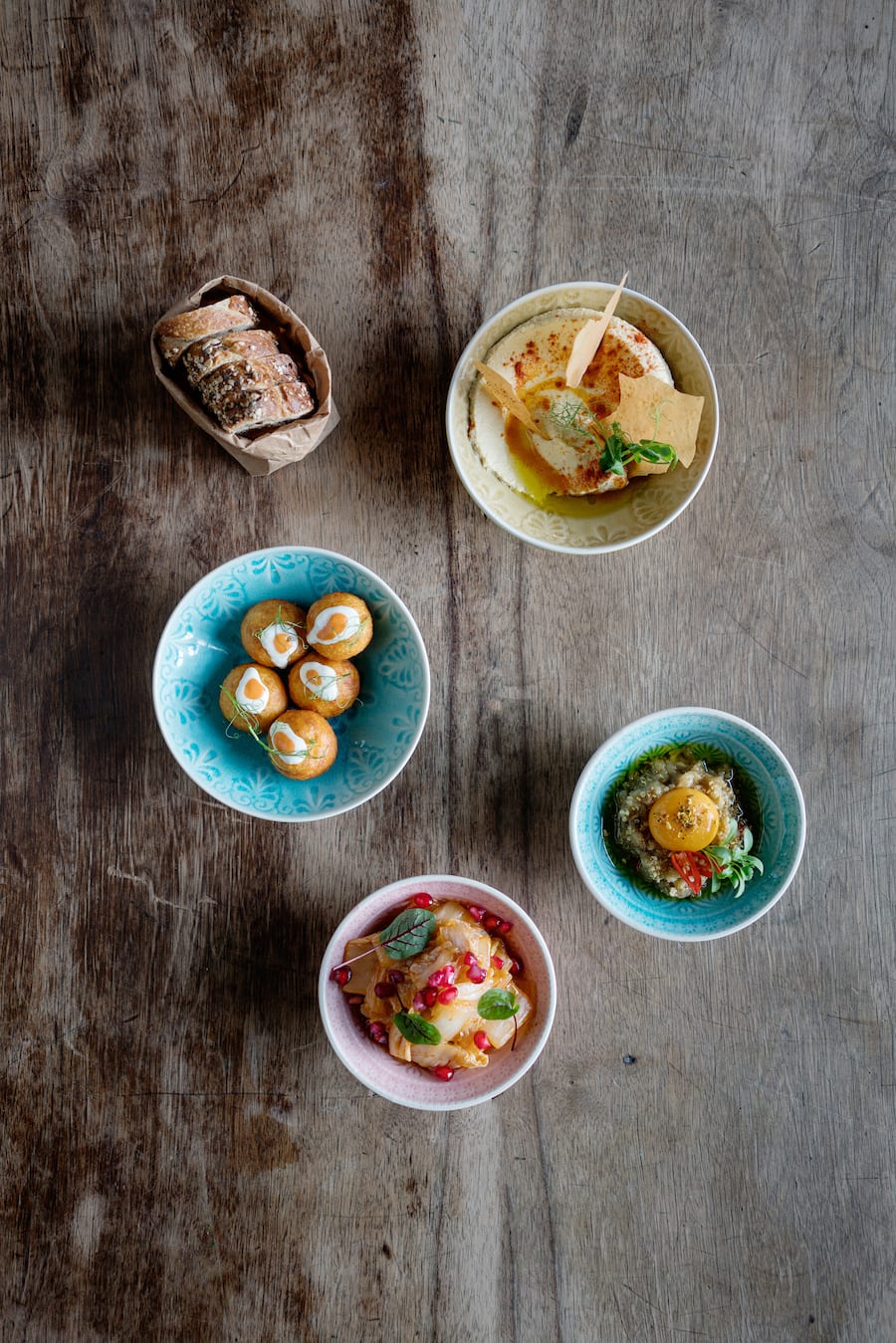 Hummus, Kartoffelpralinen, Auberginentatar und Kimchi.