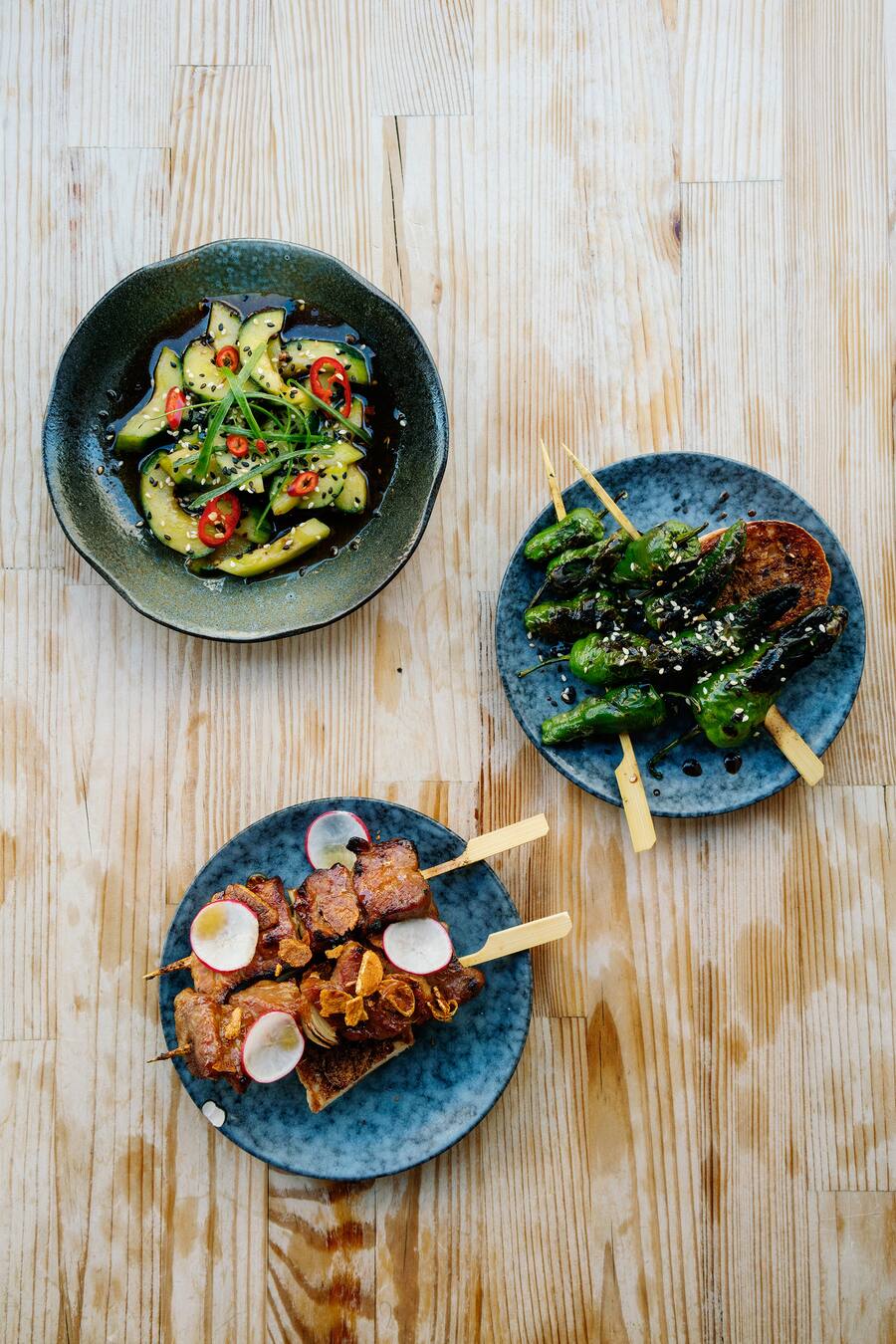 Shishito Peppers, Chicken Thighs, Pork Neck, Karaage, Topokki, Hot & Cold Cucumber, Miso Honey Eggplants, House Porchetta