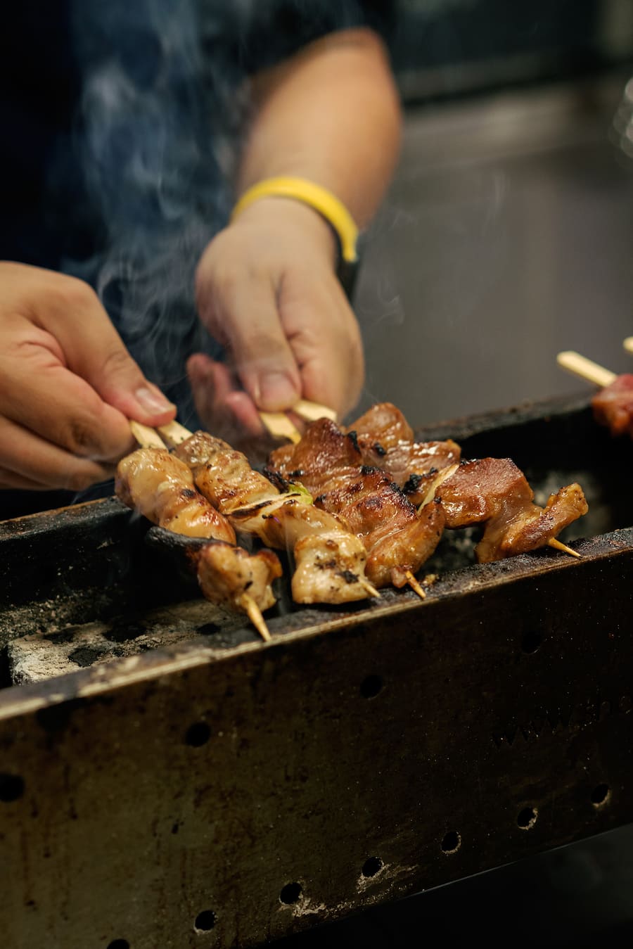 Wer sich an den Tisch setzt, erhält ein kleines Menü mit einem Bleistift, um die gewünschten Grillspiesse darauf zu vermerken. Dabei müssen Gäste pro Auswahl mindestens zwei Spiesse bestellen. «Shishito Peppers» kennst du wahrscheinlich unter dem Namen «Pimientos de Padrón» – grilliert mit Knoblauchöl erhalten sie zusätzliche Röstaromen. Aufgespiesster Schweinehals glänzt mit einer Marinade aus Miso und Honig, die leicht karamellisiert über der heissen Holzkohle. Und auch Ochsenschwanz steht auf der Karte, dessen Fleisch durch stundenlanges Schmoren eine besondere Zartheit aufweist und sich ohne Mühe vom Knochen löst. Momentan könntest du in Zürich alle japanischen Restaurants abklappern und fändest kein besseres Yakitori als bei «Nightmarkt».