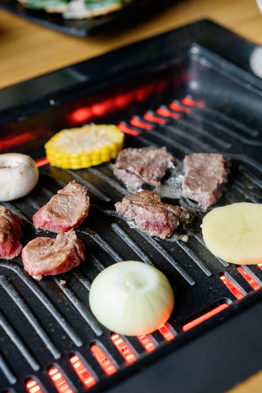 Bevor die Fleisch-Parade losgeht, gibts zur Vorspeise zuerst einmal eine köstliche Portion «Haemul Pajeon». Der herzhafte koreanische Pfannkuchen aus einem Weissmehl-Teig ist üppig gefüllt mit Sepien, Crevetten, Frühlingszwiebeln und milden Chilischoten. Hervorragend dazu passt «Makgeolli» – ein naturtrübes, alkholisches und leicht prickelndes Getränk aus fermentiertem Reis. Mit seiner süssen und leicht säuerlichen Note ähnelt es dem unfiltrierten «Nigori» Sake, besitzt jedoch nur einen leicht höheren Alkoholgehalt wie Bier. Dann schaltet die Bedienung im Restaurant den Tischgrill ein und platziert sogleich die Beilagen für das koreanische Barbecue drumherum. In den kleinen Schälchen befinden sich Kimchi, eingelegte Gurken, Zwiebeln, Rettich und Reis – sie variieren je nach Saison. Für das Fleisch stehen neben grilliertem Salz noch zwei weitere Saucen zum dippen bereit: eine süssliche Sojasauce und eine dickere Sauce aus Chili- sowie Sojabohnen-Paste und Sesamöl. Wer möchte, kann die Fleisch- und Gemüsestücke selbst grillieren oder überlässt das Ganze dem Service.